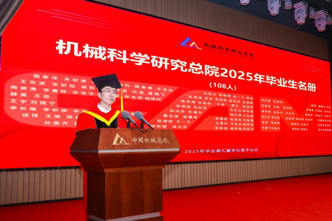 機(jī)械總院學(xué)位評(píng)定委員會(huì)主席、集團(tuán)黨委書(shū)記、董事長(zhǎng)王德成,集團(tuán)黨委副書(shū)記、總經(jīng)理孟祥宇,集團(tuán)黨委副書(shū)記、董事李玉鑫,集團(tuán)黨委委員、副總經(jīng)理王宇,機(jī)械總院學(xué)位評(píng)定委員會(huì)副主席、集團(tuán)副總經(jīng)理李?lèi)?ài)國(guó),集團(tuán)副總經(jīng)理姜超出席典禮,機(jī)械總院學(xué)位評(píng)定委員會(huì)委員、京內(nèi)外各二級(jí)單位領(lǐng)導(dǎo)、導(dǎo)師代表、研究生管理部門(mén)負(fù)責(zé)人、2025屆畢業(yè)生及家屬共計(jì)190余人齊聚一堂,共同見(jiàn)證這一重要時(shí)刻。典禮由機(jī)械總院學(xué)位評(píng)定委員會(huì)秘書(shū)長(zhǎng)、研究生院副院長(zhǎng)邊翊主持。