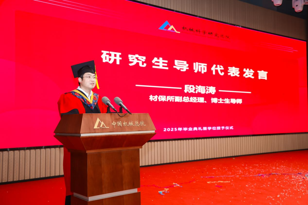 材保所副總經(jīng)理、博士生導(dǎo)師段海濤作為導(dǎo)師代表發(fā)言,為全體畢業(yè)生送上囑托和期望。他希望同學(xué)們樹(shù)立“大志向”、堅(jiān)守“大擔(dān)當(dāng)”、秉持“大情懷”,用真才實(shí)學(xué)鐫刻屬于自己的璀璨印記。